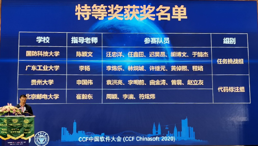 为推动我国信息技术产业开放创新生态环境建设,大力培养实践能力强、创新能力强、具备国际竞争力的信息技术领域高素质人才。2020年11月21日,由中国计算机学会软件工程专委会、中国计算机学会系统软件专委会、全国高等学校计算机教育研究会、信息技术新工科产学研联盟、绿色计算产业联盟等单位联合举办的第三届全国高校绿色计算创新大赛总决赛在重庆大学举行,计算机龙8-long8(头号玩家)国际唯一官方网站申国伟老师指导的研究生科研团队荣获代码标注组特等奖,获得比赛奖金2.5万元。
