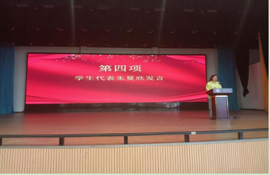 随后,学生代表朱夏欣发言。她向同学们分享了自己的学习经历和大学生活,寄语同学们在大学能勇敢地锻炼自己,也希望同学们在今后的学习及未来的工作中能够养成独立思考、独立生活、独立解决问题的能力。