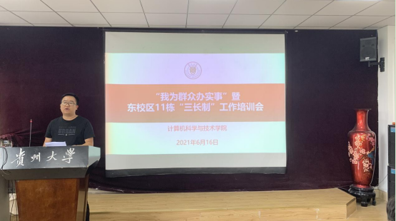 会议开始,陈开恩老师宣读《贵州大学本科生寝室长工作制度》,并介绍“三长制”试点工作的具体工作内容,此次工作将以东校区十一栋学生寝室作为试点,按区域选出楼长、层长以及寝室长,分层次、分级别管理和负责寝室日常工作。