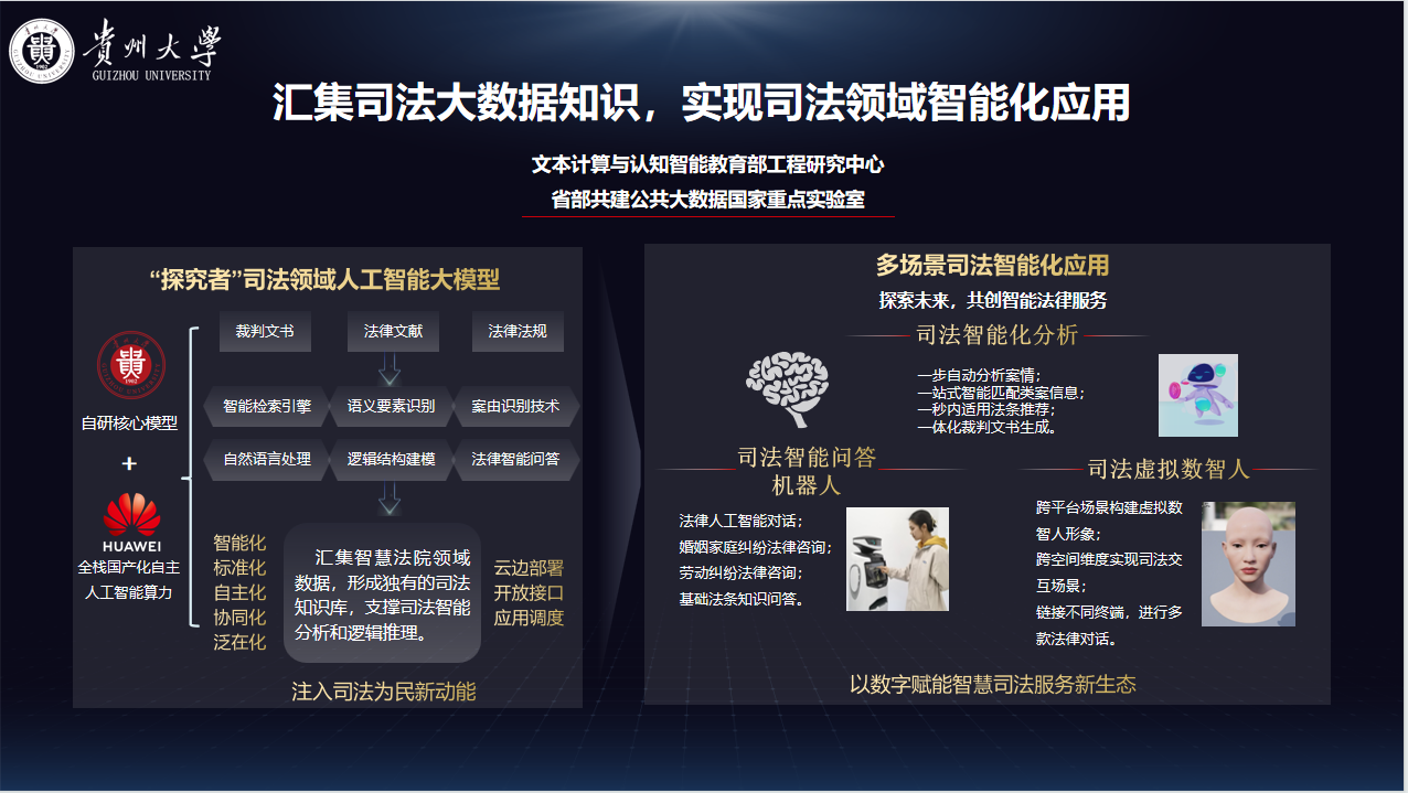 汇集司法大数据知识,实现司法领域智能化应用,2023年5月贵州数博会期间,贵州大学文本计算与认知智能教育部工程研究中心基于华为国产AI算力基座发布探究者一号司法问答大模型。工程研究中心自研核心模型,基于华为全栈国产化自主人工智能算力基座,仅用70亿参数即可做到强大的法律问答系列功能。