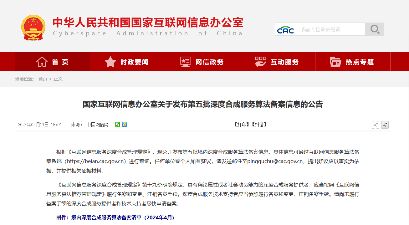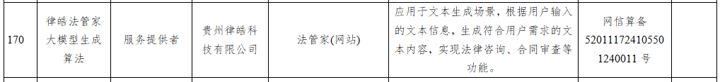 2024年4月11日,国家互联网信息办公室发布深度合成服务算法备案信息的公告,由贵州律皓科技有限公司和贵州大学联合研发的律皓法管家大模型生成算法通过此次深度合成服务算法备案,备案编号:网信算备520111724105501240011号。这是贵州第一个审核备案通过的法律领域的大模型算法备案。