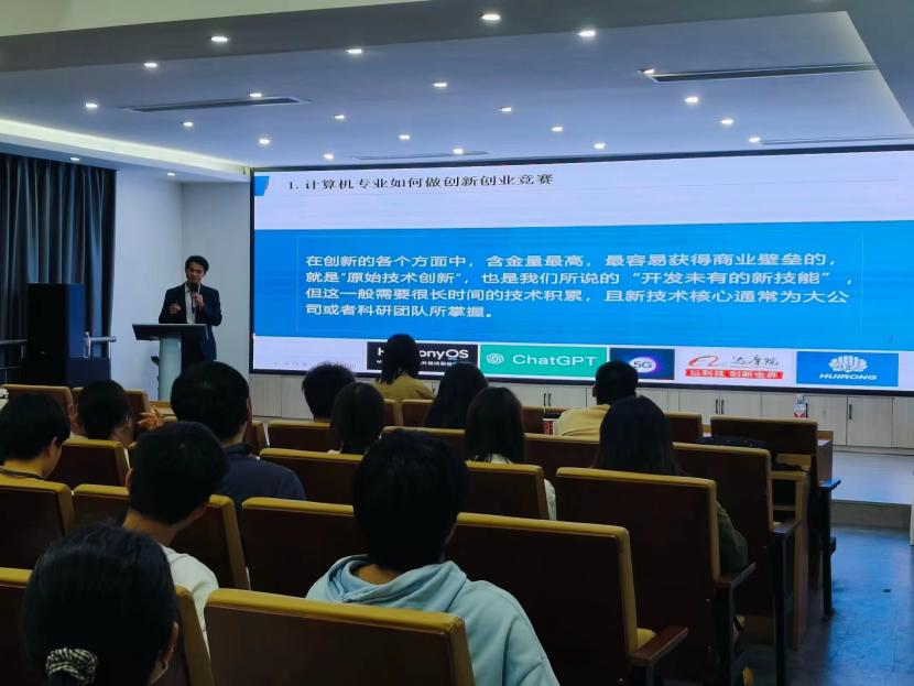 中国国际大学生创新大赛国金指导老师韦南京在第三期“乐创”分享会上为学生分享比赛PPT制作经验