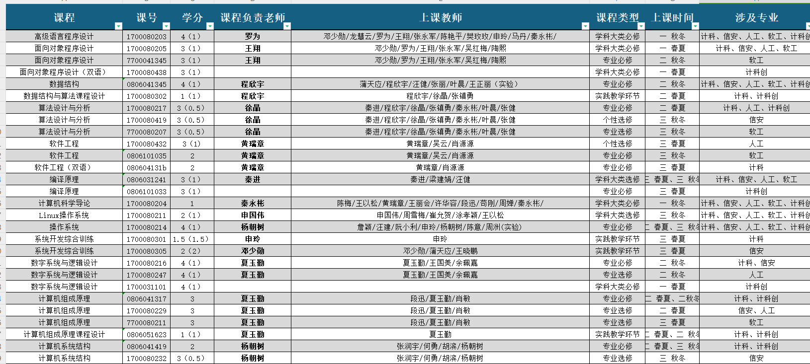 全院四个专业185门课程,按照3个核心课程群(程序设计类、计算机系统类、计算机硬件系统类,涉及26门课程)开展建设,其余159门课程按照课程组开展建设。全面推进“考教分离”、过程化考核。