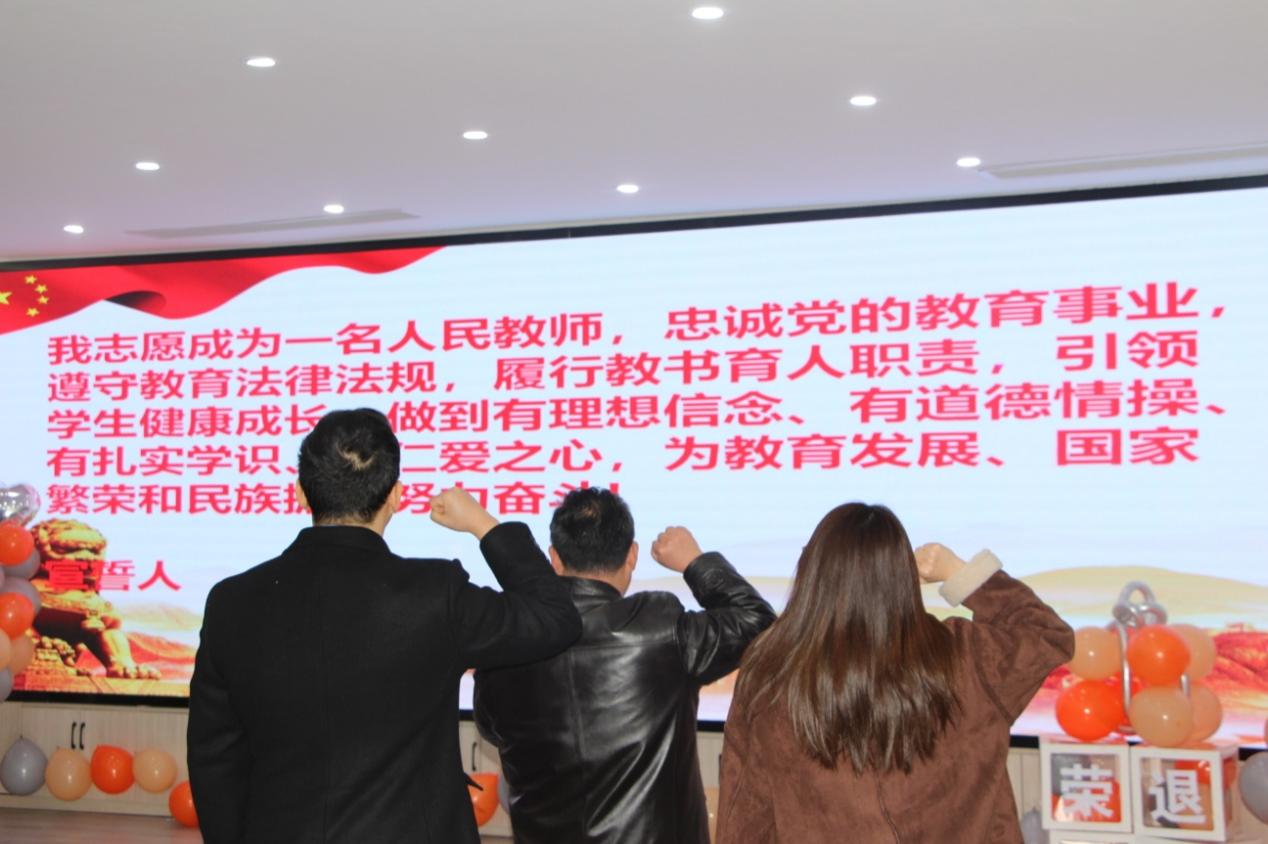 在老教师蒋朝惠教授的带领下,新进教师进行入职宣誓,提升职业的荣誉感和归属感。