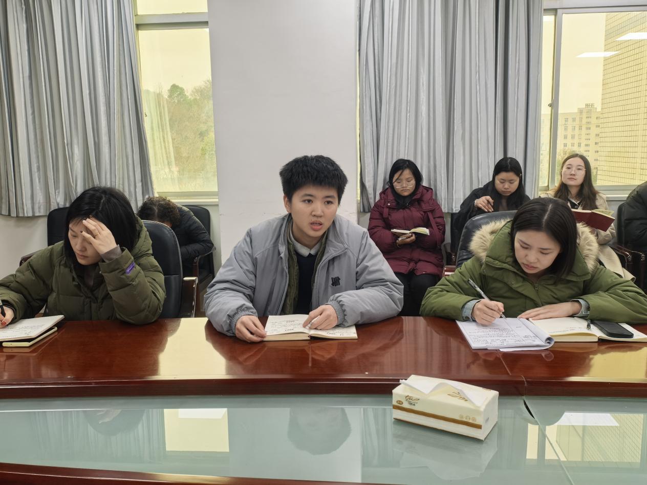 研讨开始,何飞领学“习近平总书记在2024年全国教育大会上的重要讲话精神”,何秉侜作学习分享。李健辉领学《普通高等学校学生管理规定》第二章内容并结合工作进行解读,张潇月分享学生日常事务管理心得体会。
