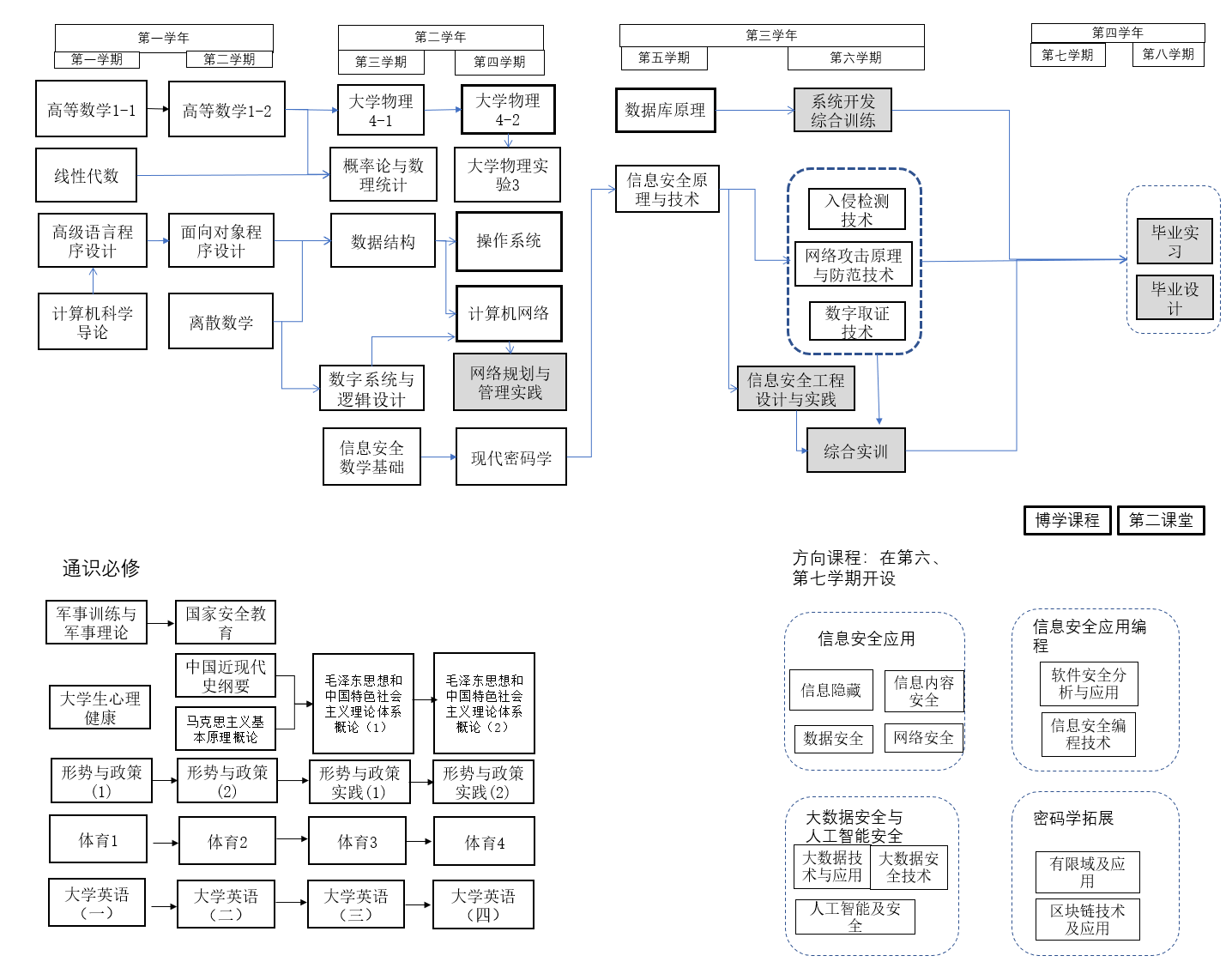 高级语言程序设计、离散数学、数字系统与逻辑设计、数据结构、计算机网络、数据库系统原理、操作系统、信息安全数学基础、现代密码学、信息安全原理与技术
